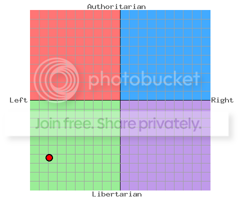 Re: Change We Can Believe In...Right? http://www.politicalcompass.org/face...0.12&soc=-3.03 Predictable. I haven’t moved much one way or the other. However, in six months I moved further up by 3 grids from Libertarian and about two hairs to the left.:beer: |